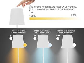 Ar vienkāršu pieskārienu jūs varat izvēlēties starp siltu, aukstu vai dabisko gaismu. Gaismas intensitāte ir regulējama, turot nospiestu barošanas pogu. Regulējamais augstums, izmantojot 5 kāta sekcijas, ļauj to novietot jebkurā mājas stūrī. Arī galdu un/vai mēbeļu stūru apgaismošanai. Komplektā USB uzlādes kabelis.
