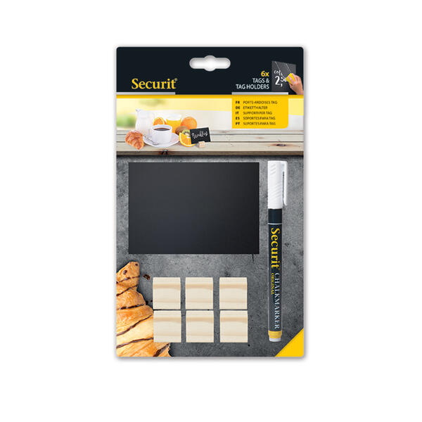 • 6 turētāji, izmērs: 2,5 x 2,5 cm • 6 etiķetes, izmērs - A7 (74x105 mm) • Komplektā: marķieris