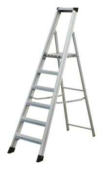 Vienpusējas alumīnija celtniecības kāpnes ar platformu. Šīs pakāpienveida kāpnes var bez problēmām novietot gandrīz jebkur un tās ir ārkārtīgi ērtas lietošanā. Plati, rievoti pakāpieni, liela platforma, margas papildu drošībai. Kāpnes ir aprīkotas ar šķērsstieņiem, kas novērš kāpņu tālāku atvēršanu, un pretslīdēšanas kājām, kas nodrošina kāpņu stabilitāti. Tehniskie dati:
