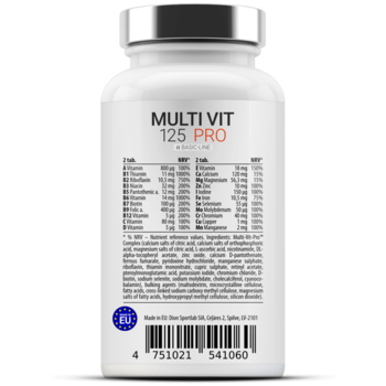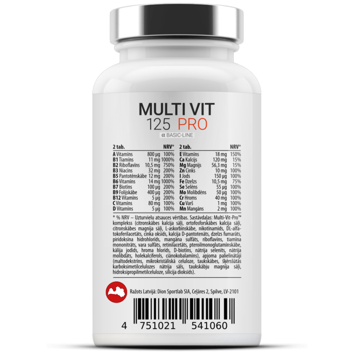 Zutaten: Multi-Vit-Pro™ Complex (calciumsalze der zitronensäure, calciumsalze der orthophosphorsäure, magnesiumsalze der zitronensäure, L-ascorbinsäure, nicotinamid, DL-alpha-tocopherylacetat, zinkoxid, calcium-D-pantothenat, eisenfumarat, pyridoxinhydrochlorid, mangansulfat, riboflavin, thiaminmononitrat, kupfersulfat, retinylacetat, pteroylmonoglutaminsäure, kaliumiodid, chrom-(III)-chlorid, D-biotin, natriumselenit, natriummolybdat, cholecalciferol, cyanocobalamin), füllstoff (maltodextrin, mikrokristalline cellulose, speisefettsäuren, vernetzte carboxymethylcellulose, magnesiumsalze der speisefettsäuren, hydroxypropylmethylcellulose, siliciumdioxid). Ⓥ Dieses Produkt ist für Vegetarier und Veganer geeignet. 1 Portion = 2 Tab. Nimm 1 Portion täglich. Bitte nicht die empfohlene Dosierung überschreiten. Gut verschlossen in der Originalverpackung an einem kühlen, trockenen und vor Sonne geschützten Ort aufbewahren. Ražotājs: