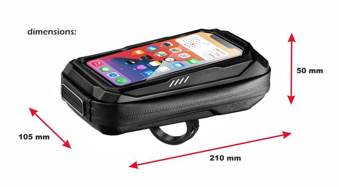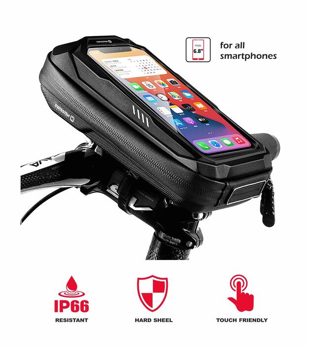 Ūdensnecaurlaidīgs velosipēda korpuss jūsu viedtālrunim. Tam ir austiņu ligzda un caurspīdīga vizla. Uzticams stiprinājums Stiprinājuma sistēma nodrošina spēcīgu un drošu pārsega stiprinājumu pie stūres vai kājas. Pārtraucot uzkodas, lietu var vienkārši atbrīvot un paņemt līdzi, izmantojot sviru. Lietderīgais apjoms Korpusā ir pietiekami daudz vietas gan personīgajiem priekšmetiem, gan instrumentiem, rezerves dušai vai powerbank. Izturīga konstrukcija Korpuss ir izgatavots no izturīga materiāla, lai viedtālrunis un citas lietas korpusa iekšpusē būtu pēc iespējas aizsargātas no iespējamiem bojājumiem un, pateicoties IP66 ūdensnecaurlaidībai, arī no laikapstākļiem. Viedtālruņa priekšskatījums Izmantojot Velcro, viedtālrunis ir piestiprināts korpusa iekšpusē zem caurspīdīgas vizlas. Viedtālruņa displejs ir lieliski redzams caur to, tāpēc korpuss ir piemērots lietošanai navigācijā. Pārdevēja garantija: 24 mēneši