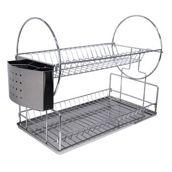 Divstāvīgs hromēts trauku žāvētājs ar spīdīgu un elegantu apdari – praktisks un stilīgs risinājums virtuves organizēšanai. Augšējais līmenis nodrošina vietu šķīvjiem un lielākiem virtuves piederumiem, savukārt apakšējais līmenis ir paredzēts krūzēm, bļodām un mazākiem traukiem. Komplektā iekļauts galda piederumu turētājs, kas palīdz uzturēt kārtību, un nerūsējošā tērauda paliktnis, kas efektīvi savāc ūdens pilienus, pasargājot virsmas no mitruma. Žāvētājs izgatavots no izturīgām dzelzs stieplēm (5 mm, 4.5 mm, 3.5 mm un 2 mm diametrā), savukārt paliktnis izgatavots no augstas kvalitātes nerūsējošā tērauda, nodrošinot ilgmūžību un izturību. Izmērs 50 x 24 x 35 cm.