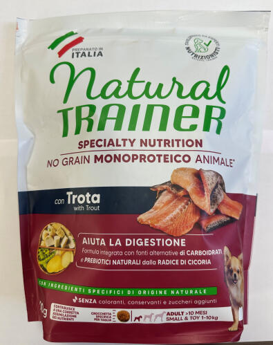 NATURAL TRAINER DOG NO GRAIN MONOPROTEICO ANIMALE ADULT SMALL&TOY TROUT 800 GR - полнорационный и сбалансированный корм для взрослых собак мелких пород (1-10 кг) от 10 месяцев и старше. С форелью. Состав: Форель* 16%, сушеный картофель* 14%, сушеный белок форели 13%, мука из семян подсолнечника, гороховый крахмал*, бекон, картофельный крахмал*, сушеный горох* 6%, гидролизат горохового белка, минералы, концентрат сушеного корня цикория (источник инулина)* 0,8%, спирулина (Arthrospira platensis)* 0,1%. *Натуральные ингредиенты. СОСТАВ: Сырой протеин 26%, сырой жир 14%, сырая клетчатка 3%, сырая зола 7%, омега-3 0,3%, омега-6 1,6%. ДОБАВКИ/кг - ПИЩЕВЫЕ ДОБАВКИ: Витамин А 27 000 МЕ, Витамин D3 600 МЕ, Витамин Е 555 мг, пентагидрат сульфата меди(II) 33 мг (медь, 8,8 мг), моногидрат сульфата железа(II) 260 мг (железо, 86 мг), йодид калия 1,9 мг (йод, 1,4 мг), селенит натрия 0,2 мг (селен, 0,1 мг), моногидрат сульфата цинка 353 мг (цинк, 129 мг), моногидрат сульфата марганца 123 мг (марганец, 40 мг). |