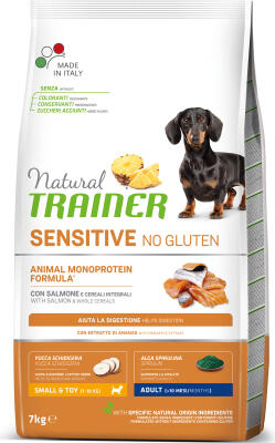 NATURAL TRAINER DOG SENSITIVE NO GLUTEN ADULT MINI SALMON Cухой корм без глютена с лососем для взрослых собак мелких пород - монопротеиновый, гипоаллергенный корм, изготовленный специально для взрослых собак мелких пород, склонных к пищевой аллергии, непереносимости и проблемам желудочно-кишечного тракта. Базовый нутрицевтик: 100% натуральный экстракт ананаса - обеспечивает правильное пищеварение. ПРЕИМУЩЕСТВА БЕЗ ГЛЮТЕНА Не содержит потенциальные аллергены: глютен, сою, дрожжи, лактозу, мясо курицы и говядины. ПРАВИЛЬНАЯ РАБОТА ЖКТ Корм улучшает пищеварение благодаря формуле содержащей цельные злаки, сухой экстракт корня цикория, обладающий пребиотическим действием и 100% натуральный экстракт ананаса. ЗДОРОВЬЕ ПИТОМЦА Спирулина, оптимальное соотношение белков, жиров, углеводов и микроэлементов обеспечивают общее здоровье и активность собаки. КОМФОРТ ДЛЯ ХОЗЯИНА Сухой экстракт Юкки Шидигера - максимально эффективно устраняет неприятный запах продуктов жизнедеятельности питомца. Ингредиенты: Дегидрированный белок лосося 11,5%, цельная кукуруза 11%, рис, кукурузный белок, горох, кукурузная мука Fioretto, рисовые отруби, лосось 6,5%, коричневый рис 4%, льняное семя*, жир животного происхождения, кукурузное масло, минералы, гипоаллергенные ароматизаторы, сухой экстракт корня цикория (источникинулина)* 0,7%, лигноцеллюлоза, сухой экстракт сердцевины ананаса* 0,1%, сухой экстракт юкки Шидигера* 0,025%, спирулина (Arthrospiraplatensis)* 0.02%. *Особые ингредиенты натурального происхождения. Анализ: Сырой белок 25%, сырой жир 15%, сырая клетчатка 2,5%, сырая зола 7%. Добавки на кг Пищевые добавки: Витамин А - 26000 МЕ, витамин D3 1350 МЕ, витамин Е 555 мг, пентагидрат сульфата меди(II) 49,13 мг (медь 12,5 мг), карбонат железа (II) 310.5 мг (железо 150 мг), гранулированный безводный йодат кальция в оболочке 3,85 мг (йод 2,5 мг), селенит натрия 0,44 мг (селен 0,2 мг), оксид цинка 193,4 мг (цинк 156 мг), оксид марганца (II) 45,1 мг (марганец 35 мг).