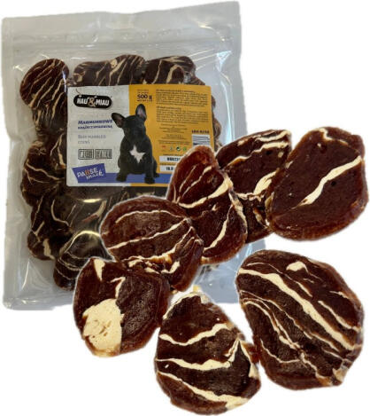 HAU & MIAU монеты из мраморной говядины 500г - дополнительный корм для взрослых собак, монеты из мраморной говядины. Состав: - говядина 92%, утиный хрящ, глицерин, кукурузный крахмал, соль, технологические добавки. Аналитические компоненты: сырой белок 36%, сырой жир 2,5%, сырая клетчатка 2%, сырая клетчатка 5,5%, влага 25%.