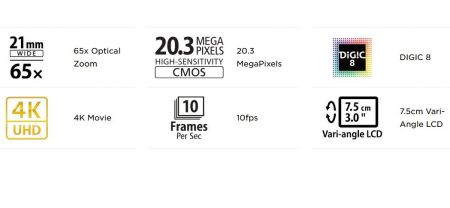 Тип 1/2,3-дюймовая CMOS-матрица с задней подсветкой Эффективные пиксели прибл. 20.3М1 Всего пикселей прибл. 21,1 млн Тип цветного фильтра Основной цвет Процессор изображений Тип ДИГИК 8 Объектив Фокусное расстояние 3,8–247,0 мм (35-мм эквивалент: 21–1365 мм) Увеличить Оптический 65x ЗумПлюс 130x Цифровой прибл. 4,0x (с цифровым телеконвертером прибл. 1,6x или 2,0x2) В совокупности ок. 260x Максимальная диафрагма f/3.4 – f/6.5 Строительство 15 элементов в 11 группах (3 линзы UD, 1 двусторонняя асферическая линза) Стабилизация изображения Да (со сдвигом объектива), прибл. 5 ступеней Фокусировка Тип время жизни Система автофокусировки/точки Face & Tracking (9 точек), Tracking, 1 точка, Spot Режимы автофокусировки Один выстрел, сервопривод, непрерывный Подсветка автофокусировки да Ручная фокусировка Да, плюс MF Peaking Ближайшее расстояние фокусировки 0 см (W) от передней части объектива в макросъемке Контроль экспозиции Замер моды Оценочный, центрально-взвешенный, точечный (кроме фильма) Блокировка автоэкспозиции да Компенсация экспозиции +/- 3 EV с шагом 1/3 ступени. Чувствительность ISO 100–3200 с шагом 1/3 ступени Затвор Скорость 15 - 1/2000 р Баланс белого Настройки Авто, Дневной свет, Тень, Облачно, Лампа накаливания, Люминесцентное освещение, Вспышка, Пользовательский. Видоискатель Видоискатель Тип 0,39, примерно 2,36 млн точек Видоискатель / Покрытие примерно 100% Диоптрийная коррекция прибл. -3,0 - +1,0 м-1 (дпт) ЖК монитор Монитор ЖК-экран с переменным углом наклона (TFT) 7,5 см (3,0 дюйма), прибл. 922 000 точек Покрытие прибл. 100% Яркость Регулируется на один из пяти уровней Вспышка Мода Авто, ручное включение/выключение вспышки, медленная синхронизация Скорость X-синхронизации Максимальная скорость 1/2000 с Коррекция красных глаз да Компенсация экспозиции вспышки +/- 2 EV с шагом 1/3 ступени. Блокировка экспозиции вспышки да Ручная регулировка мощности 3 уровня с внутренней вспышкой Синхронизация по второй шторке да Диапазон встроенной вспышки примерно 50 см - 6,5 м (Ш) / 1,8 м - 4 м (Т) Стрельба Мода Снимок, Программа AE, AE с приоритетом выдержки, AE с приоритетом диафрагмы, Ручной режим, Спорт, SCN, Творческие фильтры Панорама, Гибридный автоматический режим, Интеллектуальный автоматический режим, Пользовательский x2 Управляйте модой Одиночный, высокоскоростной непрерывный, низкоскоростной непрерывный Непрерывная съемка Макс.: One Shot AF: прибл. 10 кадров в секунду, Servo AF: прибл. 5,7 кадров в секунду Пиксели записи/сжатие Размер изображения 4: 3 - (Д) 5184 x 3888, (М) 3648 x 2736, (С) 2432 x 1824 16:9 - (Д) 5184 х 2912, (М) 3648 х 2048, (С) 2432 х 1368 3: 2 - (Д) 5184 x 3456, (М) 3648 x 2432, (С) 2432 x 1616 1:1 - (Д) 3888 x 3888, (М) 2736 x 2736, (С) 1824 x 1824 Опция изменения размера доступна при воспроизведении Сжатие Хорошо, Нормально Кино (4K) 3840 x 2160, 29,97/25 кадр/с (Full HD) 1920 x 1080, 59,94/50/29,97/25 кадр/с, (HD) 1280 x 720, 59,94/50 кадр/с Длина фильма До 29 мин 59 с4 Тип файла Тип неподвижного изображения Сжатие JPEG (совместимость с Exif 2.3 [Exif Print]) / Design rule for Camera File system 2.0, совместимость с форматом заказа цифровой печати [DPOF] версии 1.1 Кино MP4 [Видео: MPEG-4 AVC/H.264, аудио: MPEG-4 AAC-LC (стерео)] Прямая печать Принтеры Canon Компактные фотопринтеры Canon Струйные принтеры SELPHY и Canon с поддержкой PictBridge PictBridge Да (через USB или беспроводную локальную сеть) Другие особенности GPS GPS через мобильное устройство (через приложение Canon Camera Connect с совместимыми смарт-устройствами) Коррекция красных глаз Да, во время съемки и воспроизведения Гистограмма да Увеличение воспроизведения прибл. 2х - 10х