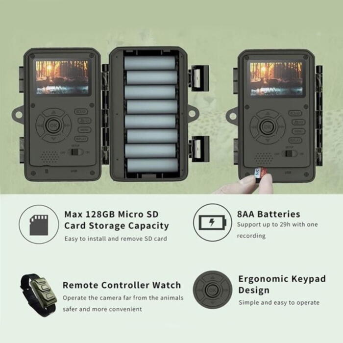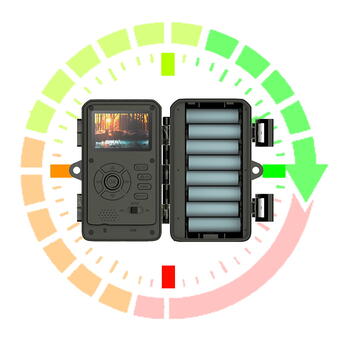 В этой охотничьей камере используется пироэлектрическая инфракрасная технология обнаружения (обнаружение животных и людей). Как только животное или человек входит прямо перед зоной обнаружения, оно автоматически начинает делать снимки или снимать видео. Если войти в левую и правую стороны областей предварительного обнаружения, это также будет стимулировать камеру к съемке в защитном состоянии. Эта охотничья камера находится в бездействующем состоянии, когда она не обнаруживает животных или человеческие тела. Это сверхнизкое энергопотребление и может работать в течение длительного времени в полевых условиях.