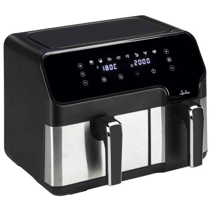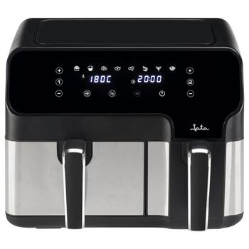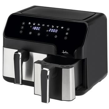 Фритюрница без масла мощностью 2700 Вт Многофункциональная панель управления Технология высокоскоростной циркуляции воздуха Емкость 9 л: корзина 5,5 л + корзина 3,5 л Таймер 0-60 мин Регулируемый контроль температуры от 80 до 200º Корзины с антипригарным покрытием Автоматическое отключение Без бисфенола-А Корзины с ручками Два разных способа приготовления и завершения одновременно Независимое программирование корзин 8 функций приготовления Защита от перегрева Нескользящее основание Напряжение 230 В Размеры корзины: Маленькая: 12 х 23 см Большая: 19 х 23 см Высота: 12,5 см