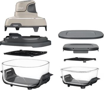 Ninja CRISPI 4-in-1 ir moderns un kompakts karstā gaisa fritieris ar stikla trauku, kas apvieno četras funkcijas vienā ierīcē – cepšana, sildīšana, kraukšķināšana un īpaši kraukšķīga apstrāde augstā temperatūrā. Tas ir ideāls risinājums mazām virtuvēm, studentiem vai ceļošanai, pateicoties tā pārnēsājamam dizainam un stikla traukiem, kurus var izmantot ne tikai gatavošanai, bet arī ēdiena uzglabāšanai un uzsildīšanai. Ierīcei ir divi borosilikāta stikla trauki, kas ir izturīgi pret temperatūras svārstībām un piemēroti lietošanai saldētavā, mikroviļņu krāsnī un trauku mazgājamajā mašīnā. Pateicoties caurspīdīgajam dizainam, Jūs vienmēr redzēsiet, kā ēdiens gatavojas. Visi komponenti ērti saliekami kopā, ietaupot vietu glabāšanai.