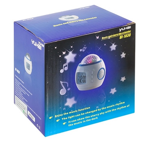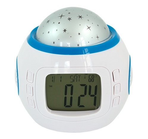 12/24 часа календарь термометр функция отсрочки функция обратного отсчета времени мелодии проектор (отображает красочную проекцию звездного неба с мелодией) подсветка дисплея 10 мелодий (звук волн, звук воды, классическая музыка) Размеры: 90 мм x 80 мм x 102 мм источник питания: батарея 3x 1.5V AAA Гарантия продавца: 24 месяца
