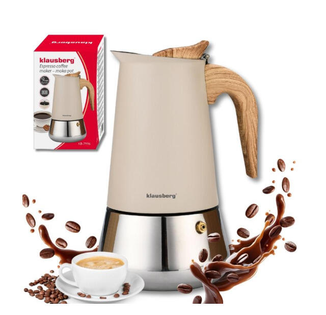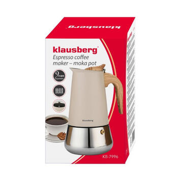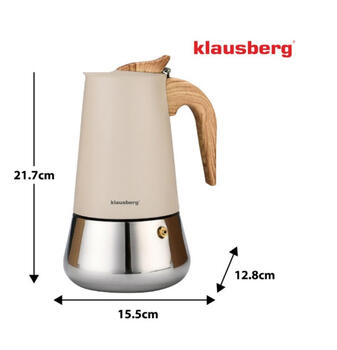 Кофеварка для эспрессо, нержавеющая сталь, на 9 чашек, черная/серебристая, Klausberg, KB 7996. Ручка и кнопка: эргономичные, под дерево. Цвет: бежево-кремовый с металлическим основанием. Совместимость: индукционная, газовая, электрическая, керамическая плита. Размеры (примерные). Высота: около 21.7 см. Диаметр основания: около 15.5 см. Верхний диаметр: около 12.8 см. Вместимость: 9 чашек эспрессо. Эргономичная ручка с внешним видом под дерево.