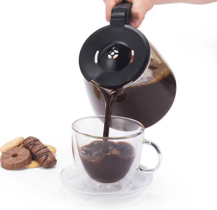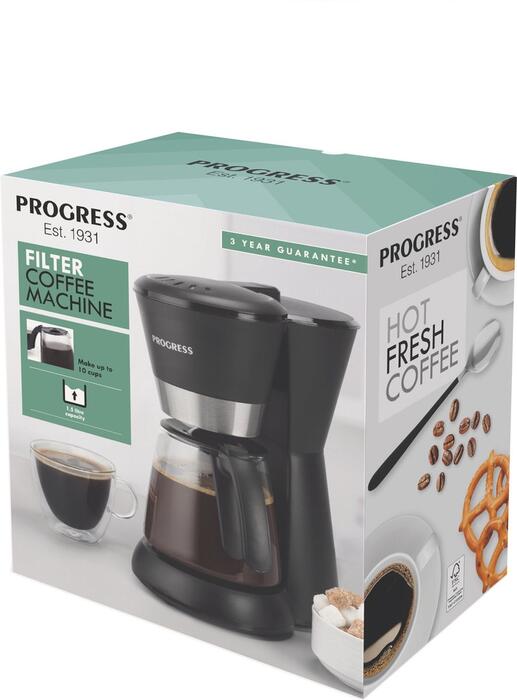 Приготовьте до 10 чашек восхитительного кофе с помощью этой фильтр-кофеварки Progress, чтобы наслаждаться свежесваренным кофе в течение всего дня. Функция поддержания тепла Функция поддержания температуры сохраняет сваренный кофе горячим до 40 минут, что идеально подходит для семейного расписания. 1,5 литра Стеклянный графин емкостью 1,5 литра придает этой кофеварке элегантный вид, благодаря чему она отлично смотрится на вашей столешнице. Фильтр многоразового использования Оснащен многоразовым съемным фильтром для легкой очистки и функцией защиты от капель, которая гарантирует чистоту и порядок. 1080 Вт Кофемашина мощностью 1080 Вт быстро варит кофе, что идеально подходит для утренней суеты, и оснащена функцией автоматического отключения для дополнительной безопасности.