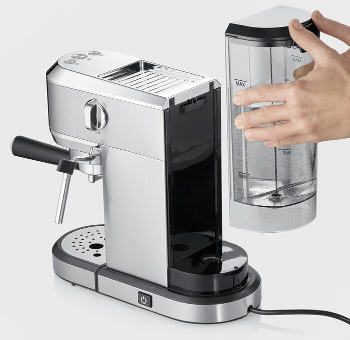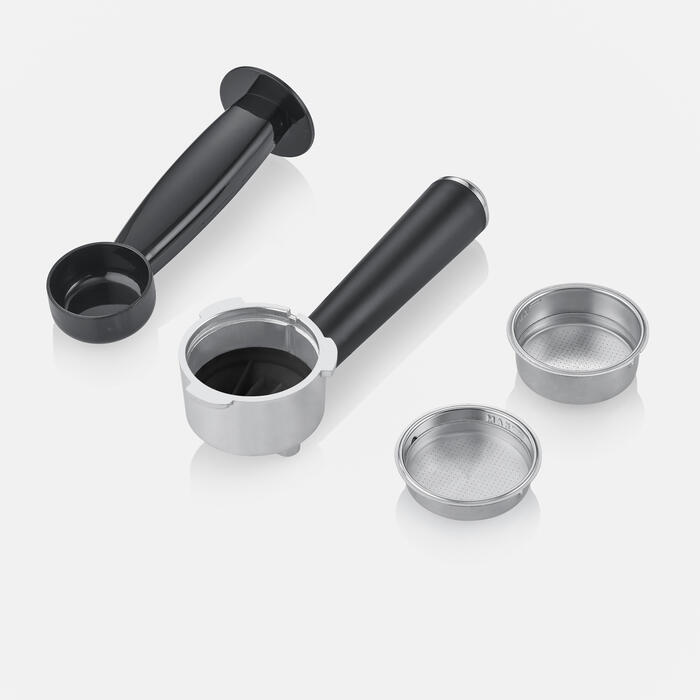 Высококачественный фильтродержатель из нержавеющей стали в тонком корпусе. Мощный итальянский насос ULKA (макс. 20 бар) для идеальной пенки и оптимального раскрытия аромата. Система нагрева Thermoblock для быстрого нагрева воды. Поворотная насадка для вспенивания молока; также может использоваться для приготовления горячей воды. Съемный прозрачный резервуар для воды объемом 1 литр для удобного наполнения. Съемный и моющийся поддон для капель со съемной решеткой для чашек. С функцией регулировки жесткости воды и удаления накипи для повышения долговечности. Аксессуары: фильтродержатель с маленьким и большим фильтром на одну или две чашки и кофейная ложка с темпером. Давление: 20 бар Мощность: 1350 Вт