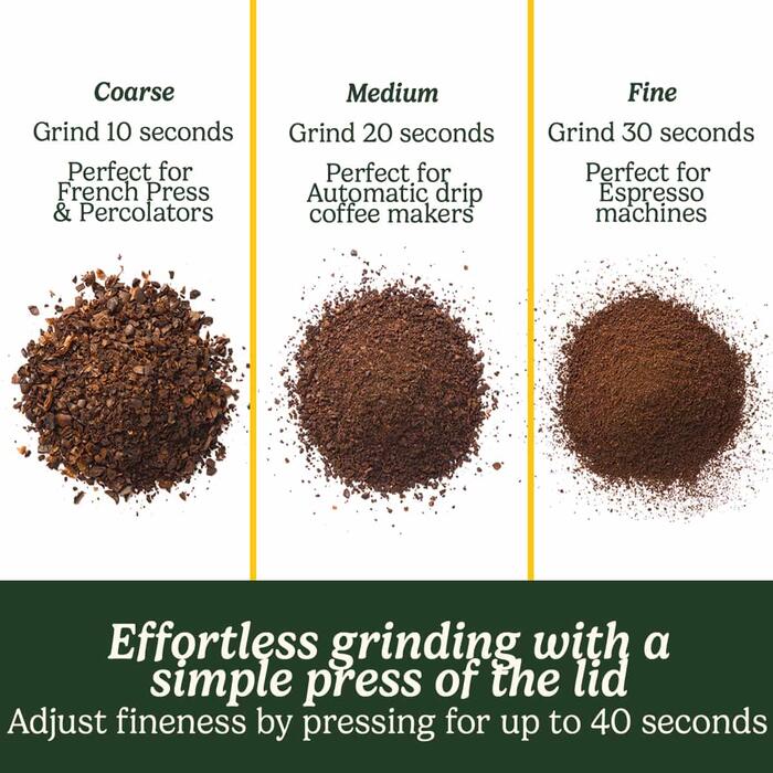 Pārveidojiet savu ikdienas kafijas pagatavošanu: Neapmieriniet sevi ar viduvēju kafiju; atklājiet savu kafijas pupiņu pilno potenciālu un uzlabojiet savu ikdienas kafijas pagatavošanu ar kompaktajām kafijas dzirnaviņām. Izturīgs nerūsējošā tērauda trauks un asmeņi: Nerūsējošā tērauda trauks un asmeņi ir pietiekami izturīgi, lai apstrādātu visu veidu kafijas pupiņas. Vienkārši nospiediet un samaliet: Kafijas malšana nekad nav bijusi tik vienkārša. Vienkārši nospiediet pogu, lai ātri un bez piepūles samaltu kafiju lietošanai franču presē/perkolatorā, pilināmajā kafijas automātā vai espresso automātā. Vienkārša maluma pakāpes regulēšana: Viegli pielāgojiet kafijas malumu. Nospiediet līdz pat 40 sekundēm, lai sasniegtu vēlamo konsistenci — rupju, vidēju vai smalku. Kompakta uzglabāšana un vienkārša tīrīšana: Pateicoties kompaktajam izmēram un integrētajai vada uzglabāšanas vietai, dzirnaviņas ir viegli uzglabāt. Noslaukāmo nerūsējošā tērauda bļodu un vāku var ātri un viegli notīrīt pēc katras lietošanas reizes. Гарантия продавца: 24 месяца