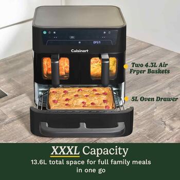 Ietilpīga 13,6 litru ietilpība — ideāli piemērota izklaidei: Ar diviem lieliem gaisa fritēšanas groziem un ietilpīgu seklu cepeškrāsns atvilktni varat pagatavot vairāk ēdiena mazākās porcijās — ideāli piemērots aizņemtām darba dienām, lielām ģimenēm vai viesu izklaidei.