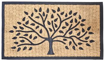 Šis dabīgās kokosšķiedras kājslauķis ar izteiksmīgu koka siluetu rada mājīgu pirmo iespaidu. Koks, kā simbols dzīvībai, stabilitātei un dabas tuvumam, piešķir ieejas zonai siltu un harmonisku noskaņu. Iegūlušais raksts ar reljefu faktūru ne vien dekorē, bet arī efektīvi savāc netīrumus no apaviem. Gumijas pamatne nodrošina neslīdošu virsmu un izturību pret mitrumu. Piemērots lietošanai gan iekštelpās, gan āra apstākļos. Pirms pirmās lietošanas ieteicams to nokratīt, jo kokosšķiedra var nedaudz birt. Izmērs 45 x 75 cm.