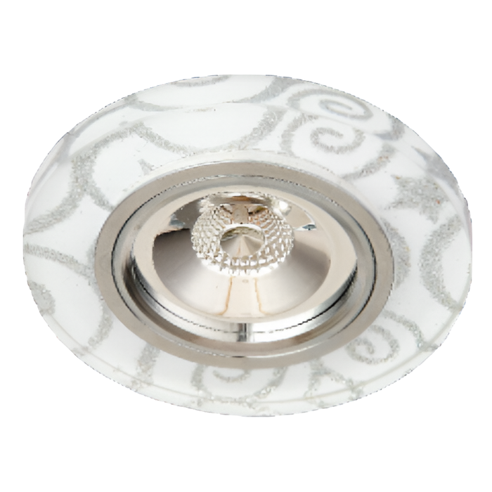 Dekoratīvais apgaismes ķermenis ar GU10 spuldzes ligzdu piešķir telpai izsmalcinātību, pateicoties baltajam stikla korpusam ar smalku, sudrabotu ornamentu. Kompaktais dizains ar integrētu hromētu apdari rada elegantu un vienlaikus neuzbāzīgu gaismas avotu, kas lieliski iederas modernā, klasiskā vai romantiskā stila interjerā. Piemērots montāžai griestos, tas nodrošina efektīvu gaismu un vizuāli papildina telpas dizaina detaļas. Ideāla izvēle dzīvojamās istabas, guļamistabas vai koridora akcentēšanai. Tehniskie dati: