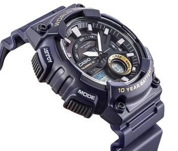 • Бренд: CASIO • Референс: AEQ-110W-2AVDF • Механизм: точный кварцевый с аналоговым и цифровым отображением • Отображение: аналоговое + цифровое • Корпус: из полимерного материала (смолы) • Безель: смола • Стекло: пластиковое (resin glass) • Ремешок: из полимерного материала (смолы) • Стандартные функции: время, минуты, секунды, 12/24-часовой формат, мировое время, секундомер, таймер обратного отсчёта, будильники, календарь • Дополнительные функции: срок службы батарейки до 10 лет, мировое время (30 городов), 3 будильника, двойное время • Водозащита: 10 bar (100 m) — подходит для плавания и водных видов спорта на поверхности (не для дайвинга) • Гипоаллергенно: да — никель не содержится, безопасно для кожи • Размер корпуса: 52 × 47 мм • Размер циферблата: 35 × 30 мм ... • Стандартные функции: время, минуты, секунды, 12/24-часовой формат, мировое время, секундомер, таймер обратного отсчёта, будильники, календарь • Дополнительные функции: срок службы батарейки до 10 лет, мировое время (30 городов), 3 будильника, двойное время • Водозащита: 10 bar (100 m) — подходит для плавания и водных видов спорта на поверхности (не для дайвинга) • Гипоаллергенно: да — никель не содержится, безопасно для кожи • Размер корпуса: 52 × 47 мм • Размер циферблата: 35 × 30 мм • Толщина: 15 мм • Ширина ремешка: 22 мм Цветовое решение: • Корпус: чёрный • Циферблат: шампань-золото • Стрелки: золотистые с люминесцентным покрытием Neobrite • Ремешок: чёрный ремешок из смолы 10-летний ресурс батарейки — надёжность и комфорт от CASIO. Гарантия продавца: 24 месяца