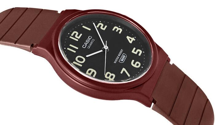 • Бренд: Casio • Модель: MQ‑24UC‑4BDF • Механизм: кварцевый • Циферблат: аналоговый • Корпус: высококачественный прочный пластик • Стекло: акриловое с повышенной стойкостью к царапинам и случайным ударам • Ремешок: поликарбонатный, водостойкий • Водозащита: 3 бар • Гипоаллергенно: да — не содержит никель, отлично подходит людям с чувствительной кожей • Подлинность: на задней крышке корпуса нанесена гравировка производителя, подтверждающая оригинальность • Диаметр корпуса: 34 мм • Диаметр циферблата: 28 мм • Толщина: 7 мм • Ширина ремешка: 18 мм • Охват запястья: 145–220 мм Цветовое решение: • Корпус: бордовый • Циферблат: чёрный • Часовые метки: белые • Стрелки: белые • Секундная стрелка: белая • Ремешок: бордовый Гарантия продавца: 24 месяца