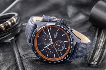 • Бренд: Lacoste • Артикул: 2011306 • Модель: Keele • Механизм: кварцевый • Циферблат: аналоговый с вспомогательными циферблатами-хронографами • Корпус: нержавеющая сталь • Стекло: минеральное • Ремешок: из натуральной кожи • Особенности: нет • Водозащита: 50 м (5 бар) • Гипоаллергенность: да — не содержит никель • Диаметр корпуса: 44 мм • Диаметр циферблата: 36 мм • Толщина: 10 мм • Ширина ремешка: 21 мм • Охват запястья: до 210 мм Цветовое оформление: • Корпус: чёрный • Циферблат: тёмно-синий с шлифованной текстурой и оранжевой окантовкой • Логотип на циферблате: тёмно-синий • Часовые метки: белые • Стрелки: белые и чёрные • Секундная стрелка: оранжевая • Ремешок: тёмно-синий с текстурой • Пряжка: чёрная • Заводная головка: чёрная Хронографы в этой модели Lacoste — это не просто декоративный элемент, а точный инструмент для измерения времени. Три грамотно расположенных малых циферблата выполняют функции секундомера, позволяя с высокой точностью отсчитывать секунды, минуты и часы. Оранжевые акценты на стрелках субциферблатов придают дизайну динамику и делают показания легко считываемыми с первого взгляда. Это отличное решение для активного мужчины, который хочет полностью контролировать своё время — будь то тренировки, работа или повседневные задачи. Ремешок из высококачественной натуральной кожи сочетает элегантность с долговечностью и удобно сидит на запястье в течение всего дня. Его тёмно-синий цвет и фактурная отделка подчёркивают утончённый характер часов, добавляя образу изысканный стиль. Со временем кожа благородно стареет, ещё сильнее подчёркивая премиальный характер модели. Гарантия продавца: 24 месяца