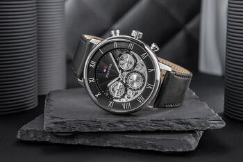 • Бренд: Tommy Hilfiger • Артикул: 1710565 • Модель: Legend • Механизм: кварцевый • Циферблат: аналоговый с хронографами (12/24-часовой формат и индикация дня/даты) • Корпус: нержавеющая сталь • Стекло: минеральное • Ремешок: натуральная кожа • Особенности: нет • Водозащита: 50 м (5 бар) • Гипоаллергенно: да — не содержит никель • Диаметр корпуса: 44 мм • Диаметр циферблата: 40 мм • Толщина: 11 мм • Ширина ремешка: 22 мм • Охват запястья: макс. 235 мм Цветовое решение: • Корпус: серебристый • Циферблат: чёрный с открытым «сердцем» и солнечной шлифовкой • Часовые метки: серебристые • Стрелки: серебристые • Секундная стрелка: серебристая • Ремешок: чёрная кожа Гарантия продавца: 24 месяца