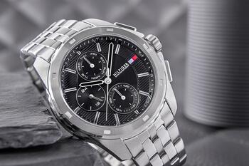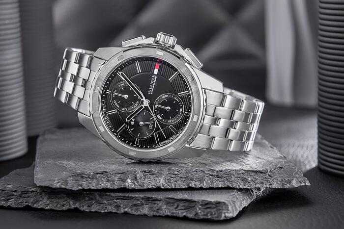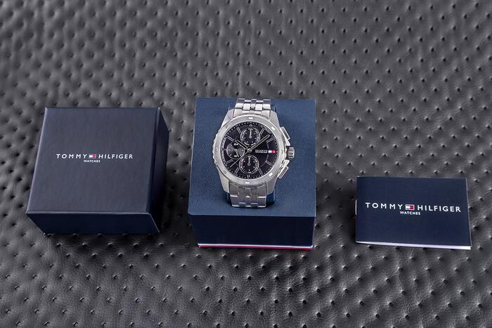 • Бренд: Tommy Hilfiger • Артикул: 1710620 • Модель: Walker • Механизм: кварцевый • Циферблат: аналоговый с субциферблатами хронографа (12/24‑часовой формат) и указателем даты (число месяца) • Корпус: нержавеющая сталь • Стекло: минеральное • Браслет: нержавеющая сталь, регулируемый • Особенности: нет • Водозащита: 50 м (5 бар) • Гипоаллергенность: да — не содержит никель • Диаметр корпуса: 44 мм • Диаметр циферблата: 34 мм • Толщина: 11,6 мм • Ширина браслета: 21,6 мм • Охват запястья: до 210 мм Цветовое решение: • Корпус: серебристый • Циферблат: чёрный • Часовые метки: серебристые • Стрелки: серебристые с чёрной заливкой по центру • Секундная стрелка: серебристая • Браслет: серебристый Гарантия продавца: 24 месяца