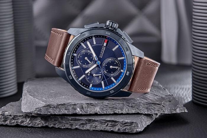 Описание товара: • Бренд: Tommy Hilfiger • Артикул: 1710632 • Модель: Walker • Механизм: кварцевый • Циферблат: аналоговый с субциферблатами хронографа (12/24‑часовой формат) и индикаторами дня недели и даты (день недели и число месяца) • Корпус: нержавеющая сталь • Стекло: минеральное • Ремешок: натуральная кожа • Особенности: нет • Водозащита: 50 м (5 бар) • Гипоаллергенность: да — не содержит никель • Диаметр корпуса: 44 мм • Диаметр циферблата: 34 мм • Толщина: 11,6 мм • Ширина ремешка: 21,6 мм • Охват запястья: до 210 мм Цветовое решение: • Корпус: чёрный • Циферблат: тёмно‑синий металлик с чёрной и синей окантовкой • Часовые метки: серебристые с белой заливкой • Стрелки: серебристые с белой заливкой • Секундная стрелка: синяя • Ремешок: коричневый кожаный, пряжка чёрного цвета Гарантия продавца: 24 месяца