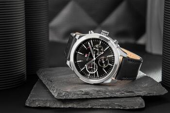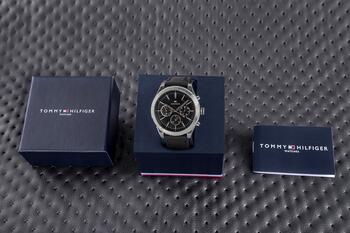 • Бренд: Tommy Hilfiger • Артикул: 1791740 • Модель: Ashton • Механизм: кварцевый • Циферблат: аналоговый с хронографами (12/24-часовой формат и индикация дня/даты) • Корпус: нержавеющая сталь • Стекло: минеральное • Ремешок: натуральная кожа • Особенности: нет • Водозащита: 50 м (5 бар) • Гипоаллергенно: да — не содержит никель • Диаметр корпуса: 44 мм • Диаметр циферблата: 37 мм • Толщина: 10,5 мм • Ширина ремешка: 21 мм • Охват запястья: макс. 210 мм Цветовое решение: • Корпус: серебристый • Циферблат: чёрный • Часовые метки: белые и чёрные • Стрелки: серебристые • Секундная стрелка: серебристая с красным акцентом • Ремешок: чёрная кожа Гарантия продавца: 24 месяца