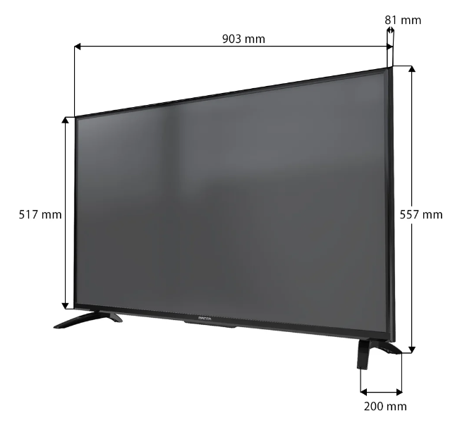 Технические данные Размер экрана: 40 дюймов Диагональ экрана: 100 см Тип подсветки матрицы: DLED Разрешение: 1920 x 1080 FHD Время отклика матрицы: 8 мс Тюнер: DVB-C/T2 H.265 HEVC Умная система: Нет Формат изображения: 16:9 Яркость: 210 кд/м² Статическая контрастность: 5000:1 Динамическая контрастность: 5 000 000:1 Углы обзора: 176° Мощность динамика: 2x8 Вт Звуковая система: DD+ Шумоподавление: 3D Гостиничный режим: Да Телетекст: Да RF: 2 USB 2.0: 1 HDR: Not HDMI 1.4: 2 CI +: 1 COAX: 1 Размеры без подставки: 902,7 х 516,7 х 81,2 мм Размеры с подставкой: 902,7 х 556,9 х 200,4 мм Стандарт VESA (мм): 200x200 мм Питание: 100-240 В переменного тока, 50/60 Гц Энергопотребление в режиме ожидания: <0,5 Вт Класс энергопотребления: G Энергопотребление SDR: 46 кВтч / 1000 ч В комплекте: телевизор, пульт ДУ, батарейки ААА, гарантийный талон, инструкция, ножки для сборки