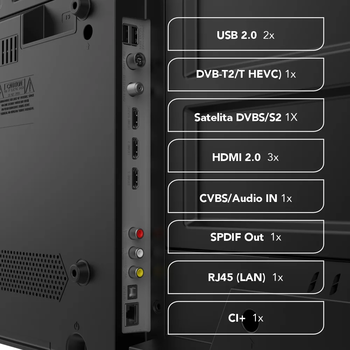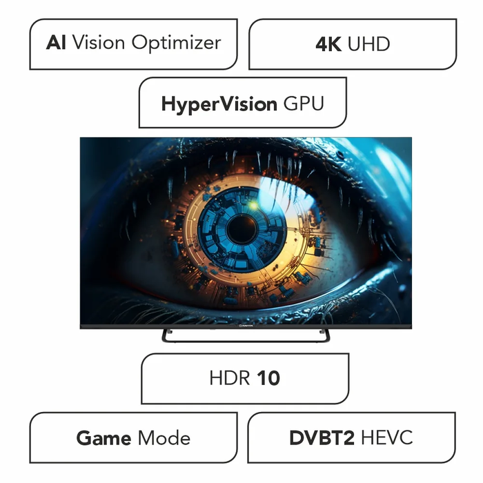 Система оснащена оптимизированной SMART-платформой на базе VIDAA. В телевизоре есть два тюнера для приёма сигналов SAT и DVB-T2. Дизайн без рамок и тонкий, с мощным четырёхъядерным процессором. Используется новейшее программное обеспечение HyperVision GPU с расширенными возможностями GPU. Телевизор предлагает игровой режим с низкой задержкой и использует IPS (In-Plane Switching) LED-панель с разрешением 4K UHD. Поддерживает HDR 10 и объемный звук Dolby Digital Plus 5.1. Порты HDMI поддерживают CEC и ARC для улучшенного аудиосоединения. Предустановлены основные приложения для просмотра фильмов, ТВ-шоу и развлечений. Кроме того, устройство включает режим отеля для профессионального или коммерческого использования.
