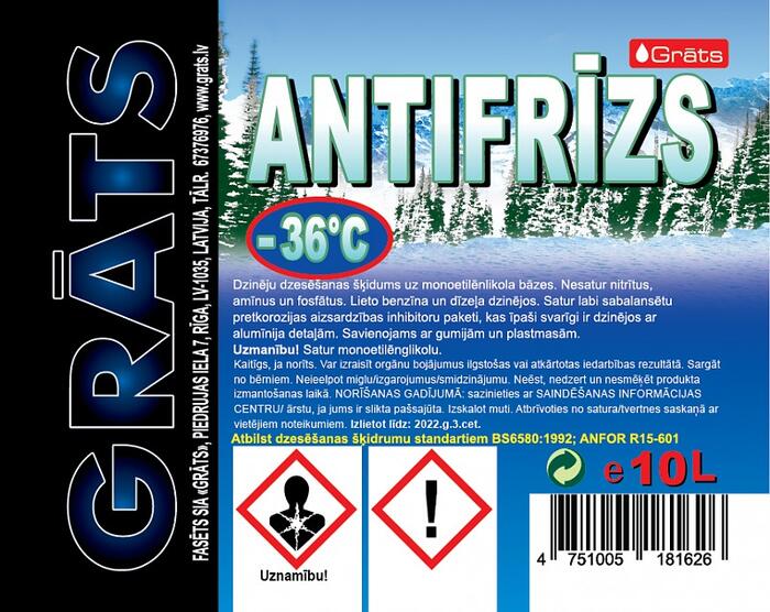Dzinēju dzesēšanas šķidrums zaļais antifrīzs -36C° uz monoetilēnlikola bāzes. Nesatur nitrītus, amīnus un fosfātus. Lieto benzīna un dīzeļa dzinējos. Satur labi sabalansētu pretkorozijas aizsardzības inhibitoru paketi, kas īpaši svarīgi ir dzinējos ar alumīnija detaļām. Savienojams ar gumijām un plastmasām Ražotājs: SIA "GRATS" Uzmanību! Liela izmēra prece,piegāde ar Omnivu un CircleK nav iespējama.Satur monoetilēnglikolu. Kaitīgs, ja norij. Var izraisīt orgānu bojājumus ilgstošas vai atkārtotas iedarbības rezultātā. Гарантия продавца: 24 месяца