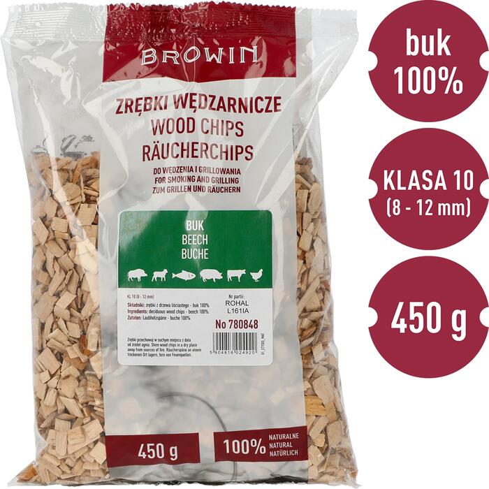 Количество чипсов в упаковке (450 г) достаточно для нескольких часов копчения (в зависимости от используемого оборудования) — не беспокойтесь о том, что они закончатся во время приготовления ваших любимых блюд. Натуральные, высококачественные буковые чипсы, универсальные - идеальны для копчения и гриля всех видов мяса. С их правильной дозировкой и подгоранием, процесс приготовления будет проходить профессионально, а готовые блюда приобретут соответствующий аромат, вкус и внешний вид. Преимущества этих чипсов оценит каждый любитель вкусных копченых и жареных блюд. Оптимальное содержание влаги обеспечивает легкость зажигания чипсов и эффективное производство дыма. Узнайте больше о чипсах в нашей статье блога Выберите чипсы и создайте дым! Проверьте наш Калькулятор мяса – он поможет вам приготовить вкусные домашние продукты. Инструкции по использованию: Гриль: Разложите слой чипсов толщиной два сантиметра вокруг раскаленного угля - не кладите их непосредственно на угли, так как они сразу сгорят. Чтобы использовать чипсы экономно, вы можете слегка смочить их водой, что облегчит производство большего количества дыма. Накройте гриль крышкой непосредственно после размещения блюд на решетке. Время жарки – от 10 до 30 минут (в зависимости от размера и типа мяса). Копчение: В зависимости от типа коптильни, поместите чипсы в коптильню – в отведенном месте, возможно в дымогенераторе или в угольнике – вокруг раскаленного дерева. Чипсы идеально подходят для использования в дымогенераторе. Использование такого дымогенератора гарантирует достижение самых профессиональных результатов – продукты с отличным вкусом, ароматом и цветом. Примечание: Управление коптильней и грилем должно выполняться только взрослыми, соблюдая правила пожарной безопасности и ознакомившись с инструкциями по эксплуатации устройства и рекомендациями по использованию чипсов. Будьте осторожны при зажигании чипсов и их добавлении во время работы гриля или коптильни и дымогенератора, чтобы избежать возможных ожогов. Убедитесь, что дети и домашние животные не имеют доступа к нагревательным устройствам. Чипсы следует хранить в сухом, прохладном месте. Копченые чипсы, доступные в нашем предложении, имеют положительные отзывы: от Института мяса и жира, Национального института гигиены и Национального санитарного института. Упаковка содержит 450 г чипсов.