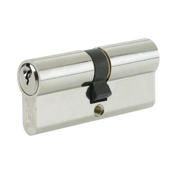 Simetrisks eirocilindrs hroma krāsā. Garums 35 + 35 mm. Komplektā 5 atslēgas.