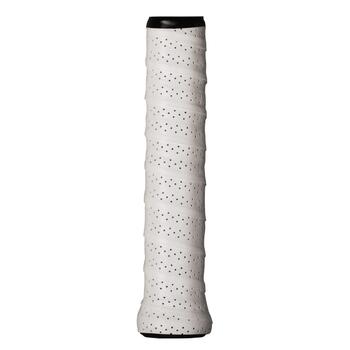 Tenisa raketes roktura grips ar perforāciju, lai uzlabotu absorbēšanu. Testi rāda, ka baltā krāsa veicina Pro Overgrip unikālo satveramību.